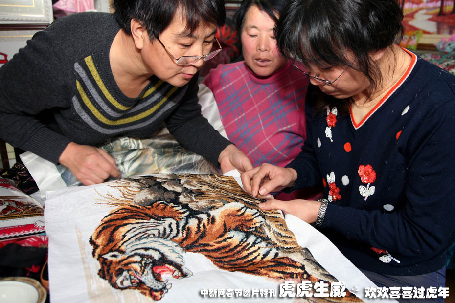 12月21日,市民們展示繡好的“虎年生肖”蘇繡作品;⒛昱R近,北京市懷柔區(qū)泉河街道社區(qū)居民蘇繡“虎生肖”圖畫,抒發(fā)對(duì)新年的美好祝福和期盼,歌頌美好生活迎接虎年的到來。中新社發(fā) 卜向東 攝