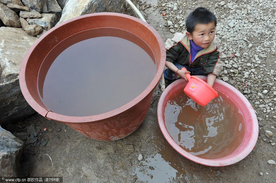 3月16日,貴州省開陽(yáng)縣城關(guān)鎮(zhèn)青西村村民付燕子帶著孩子在水庫(kù)底找水。連日來(lái),貴州省旱情加劇,貴陽(yáng)市郊開陽(yáng)縣城關(guān)鎮(zhèn)居民飲水源青西村水庫(kù)幾乎干涸。貴州省開陽(yáng)縣城關(guān)鎮(zhèn)青西村一兒童在接水。吳東俊/CFP