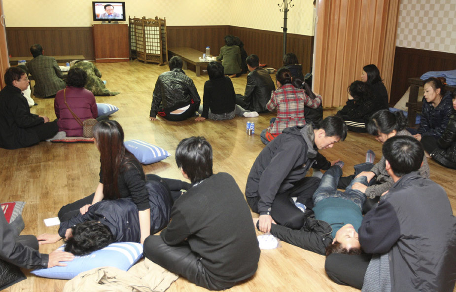 首爾當地時間26日晚9點45分許,在韓國西部海域執(zhí)行警戒任務的天安艦(1200噸級)因不明原因事故,船底被炸開洞,船尾開始下沉。天安艦上共有104人,韓國巡邏艇和直升飛機迅速展開救援行動,事發(fā)5小時后,官員稱已救出58人,但因為強風和夜幕,救援行動進展緩慢,其它人員仍下落不明。圖為韓國海軍“天安艦”上士兵的家屬正圍在電視前等待消息。