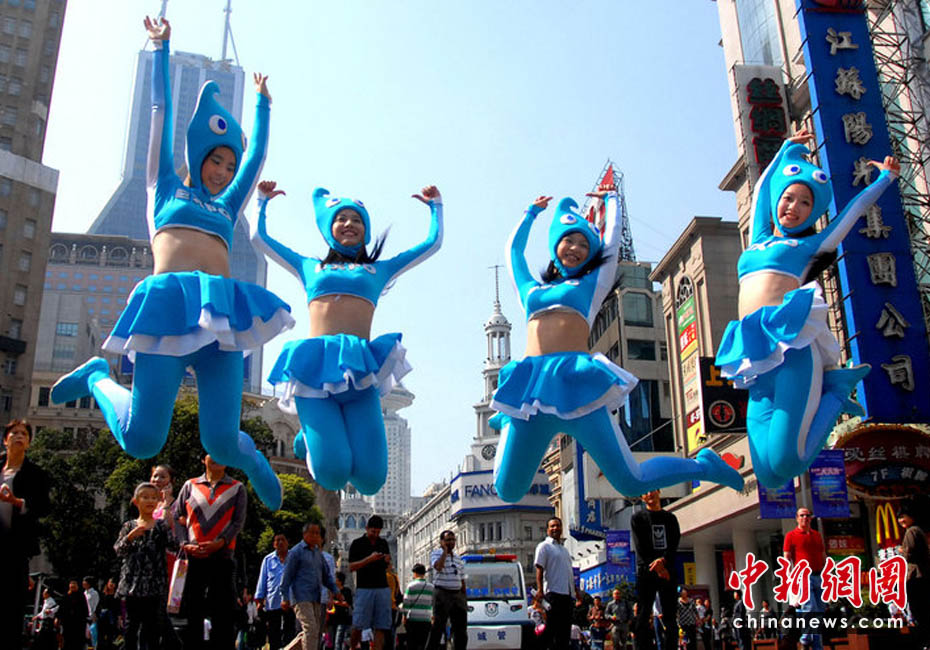 上海南京路步行街,幾名“海寶”打扮的少女出現(xiàn)在街頭,引起不少路人和游客的觀看。這是上海商貿(mào)旅游學(xué)校的女學(xué)生扮演的“歡樂海寶”,她們參加演出后,在街頭通過生動(dòng)的形體語言來展示世博會(huì)的可愛吉祥物--“海寶”。 楊毅CFP