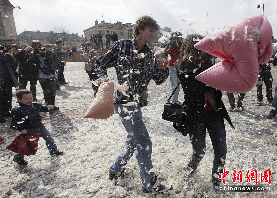 4月3日是國(guó)際“枕頭大戰(zhàn)”日。在這一天,多個(gè)國(guó)家的“枕頭大戰(zhàn)”愛好者相約走上街頭,用獨(dú)特的方式來(lái)慶祝他們的節(jié)日。圖片來(lái)源:中國(guó)新聞網(wǎng)