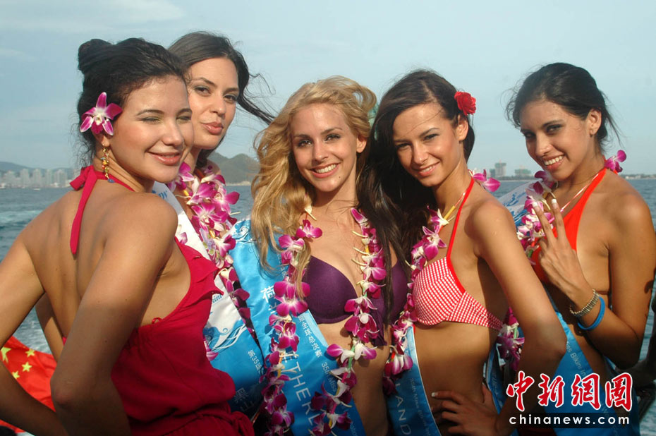 5月23日,全球64位比基尼佳麗們參加了三亞“清涼一夏 文化三亞”夏季旅游促銷活動(dòng)的啟動(dòng)儀式及系列主題活動(dòng),與三亞市民和游客親密接觸,跳起了歡快的竹竿舞,并乘豪華游艇暢游三亞。中新社記者 尹海明 攝