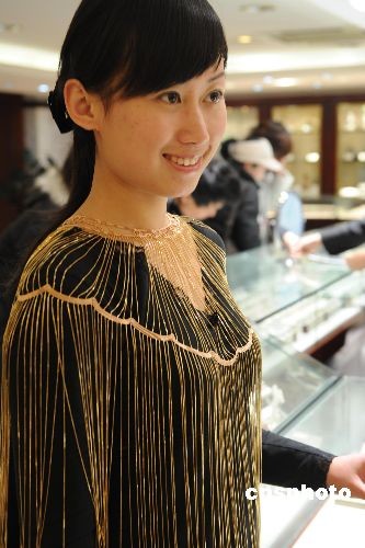 3月10日,在濟南泉城路一家金店,店員向顧客展示一款價值29.8萬元的金質披肩。據店方介紹,這款披肩在國內首度亮相,采用18k金機織而成,設計獨特,十足珍貴。中新社發(fā) 羅波 攝