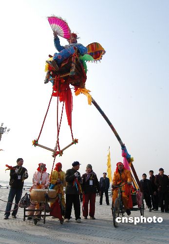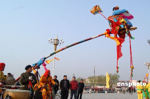 | 3月21日,在河南省淮陽(yáng)縣太昊陵二月廟會(huì)上,一種獨(dú)特的民俗表演活動(dòng)吸引了眾人的眼球。只見一個(gè)人坐在一個(gè)高高的竹椅上,下面有個(gè)長(zhǎng)長(zhǎng)的竹竿支撐,幾個(gè)人在下面拉著,竹竿架在一輛三輪車上,如同一個(gè)杠桿。坐在空中的人一會(huì)兒在椅子上玩扇子,一會(huì)兒躺在兩個(gè)繩子上翻滾,精彩的表演引得下面的觀眾掌聲不斷。據(jù)介紹,這叫獨(dú)竿轎,又叫閃竿轎、抬竿轎,是淮陽(yáng)古老的民俗表演活動(dòng)之一,在當(dāng)?shù)匾呀?jīng)消失了近40年。古時(shí)表演時(shí)需要16個(gè)人,現(xiàn)在經(jīng)過(guò)改裝,變成了獨(dú)竿,只要6個(gè)人就能完成。中新社發(fā) 楊正華 攝