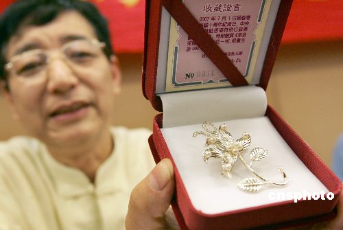 |   6月26日,受中央人民政府駐香港特別行政區(qū)聯(lián)絡(luò)辦公室委托,由中國(guó)工藝美術(shù)大師朱炳仁設(shè)計(jì)的香港回歸祖國(guó)十周年紀(jì)念禮品--“紫荊胸花”和“經(jīng)典香港青銅藏書(shū)票”完成制作,并于當(dāng)日下午從杭州啟運(yùn)香港,將在香港回歸祖國(guó)十周年紀(jì)念活動(dòng)中作為禮品贈(zèng)送嘉賓。據(jù)介紹,“紫荊胸花”為抽象圖形純銀制作,花芯“10”字符鑲有鋯石,花瓣上鑲著10顆珍珠,寓意“東方之珠”回歸十周年,僅制作990枚;而“經(jīng)典香港”金屬藏書(shū)票一套共9枚,其中一枚為純銀鍍金,另八枚為純青銅制作,票面圖案左邊為紫荊花朵,右邊為香港的九處標(biāo)志性建筑及景觀,限量發(fā)行數(shù)為12007套。中新社發(fā) 李忠 攝