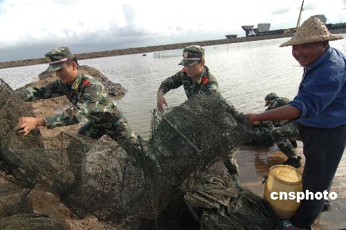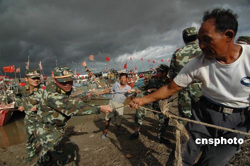 | 8月7日,邊防官兵在浙江省臺(tái)州市前所鎮(zhèn)濤江閘幫助漁民固定漁船。當(dāng)日,浙江省臺(tái)州市漁政、邊防、海事等部門及時(shí)做好臺(tái)風(fēng)來臨前的宣傳工作,通知出海船只回港避風(fēng),并要求轄區(qū)漁排養(yǎng)殖、危房群眾及時(shí)做好轉(zhuǎn)移準(zhǔn)備。據(jù)氣象部門預(yù)計(jì)“帕布”將于8日上午在臺(tái)灣中南部沿海登陸,并穿過臺(tái)灣海峽,于8日傍晚到夜里在福建中南部沿海登陸。8日上午起,浙中南沿海海面將出現(xiàn)9-11級(jí)偏東風(fēng),浙北沿海海面8日下午起有7-9級(jí)偏東大風(fēng)。8日下午起浙東和浙中南地區(qū)有中到大雨,其中溫州、麗水和臺(tái)州有大到暴雨、局部大暴雨。中新社發(fā) 朱孝欽 攝