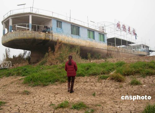 12月10日清晨,湖南境內湘江流域長沙段面臨最低枯水位,游船高高擱淺在干涸的河床上。2007年汛期之后,湖南省降雨持續(xù)偏少,旱情迅速發(fā)展,已持續(xù)兩個多月,湘江水位持續(xù)走低,部分江段出現(xiàn)歷史記載以來的最低水位。據(jù)統(tǒng)計,目前湖南全省因旱造成4500多個村民組8.3萬多人及4萬多頭大牲畜飲水困難。中新社發(fā) 劉雙雙 攝