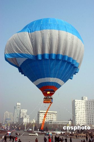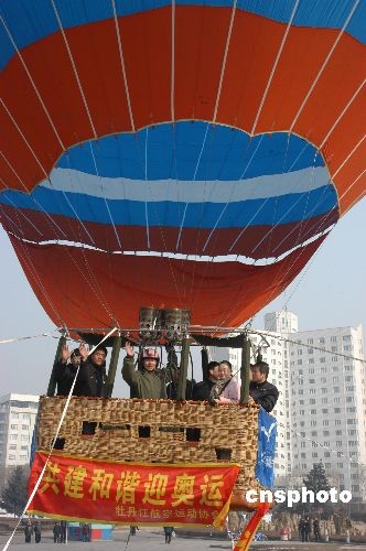 3月12日,黑龍江省牡丹江市航空協(xié)會舉辦的迎奧運熱氣球升空活動在江濱廣場舉行。一只體積達(dá)8000立方米、載荷2.2噸、亞洲最大的熱氣球在廣場升起,“共建和諧奧運”的條幅代表了航空愛好者的心聲。此次活動吸引了許多市民前來觀看。中新社發(fā) 張克非 攝