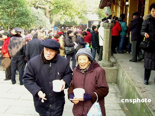 2009年1月3日,中國(guó)農(nóng)歷臘月初八傳統(tǒng)“臘八節(jié)”,清晨5點(diǎn)開(kāi)始杭州寺廟就擠滿前來(lái)免費(fèi)領(lǐng)取臘八粥的市民,以祈福新的一年。中新社發(fā) 王磊 攝