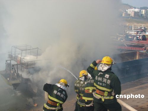 1月3日13時20分許,廣西梧州桂江上一艘貨船突然起火。由于火勢大,貨船噴出的火苗很快點燃?吭谂赃叺牧硪凰邑涊啠⑽<班徑10多艘貨輪。梧州消防支隊調(diào)集水上中隊和河?xùn)|中隊官兵奮戰(zhàn)近50分鐘,終于將大火撲滅,事故中無人員傷亡。據(jù)了解,當時起火貨船靠岸后船主上岸辦事,不料隨后船艙起火。中新社發(fā) 何永崇 攝