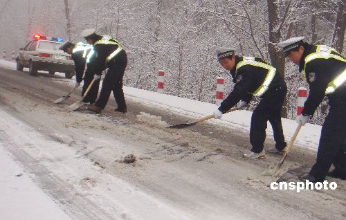 2009年1月4日,安徽省巢湖市含山縣交警大隊(duì)太湖山中隊(duì)的干警正在太湖山險(xiǎn)要路段鏟雪。元月3日夜間,該縣迎來(lái)今冬第一場(chǎng)雪,部分路段已積上厚厚的冰層。為了給即將來(lái)臨的春運(yùn)工作打下堅(jiān)實(shí)的基礎(chǔ),維護(hù)良好的道路交通秩序,給廣大群眾營(yíng)造良好的交通環(huán)境,當(dāng)天一大早,含山縣交警大隊(duì)太湖山中隊(duì)組織民警上路巡邏,重點(diǎn)加強(qiáng)對(duì)山路的安全隱患排查清理。中隊(duì)民警鏟除幾個(gè)連速?gòu)澋郎系暮駥颖,并用掃帚將鏟除堆積的冰雪清掃出路邊,保證了過(guò)往車輛的安全通行。中新社發(fā) 豐成 攝