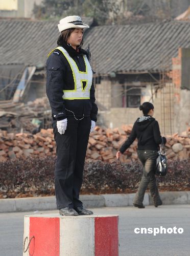 一名女警在四川大地震重災(zāi)區(qū)的北川縣安昌鎮(zhèn)街頭上崗指揮交通。北川縣城被大地震摧毀后,縣機關(guān)轉(zhuǎn)移此地辦公,將于2009年春節(jié)后開始新北川城的建設(shè)。中新社發(fā) 賈國榮 攝