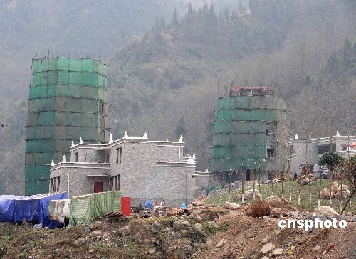 中國農(nóng)歷春節(jié)前,四川大地震重災(zāi)區(qū)北川縣重建的新羌寨里,為尊重民族習(xí)俗,筑起高大的抗震羌族碉樓。中新社發(fā) 賈國榮 攝