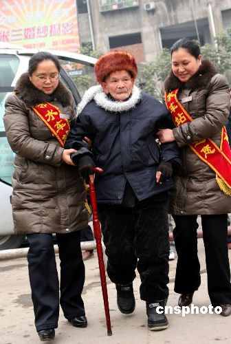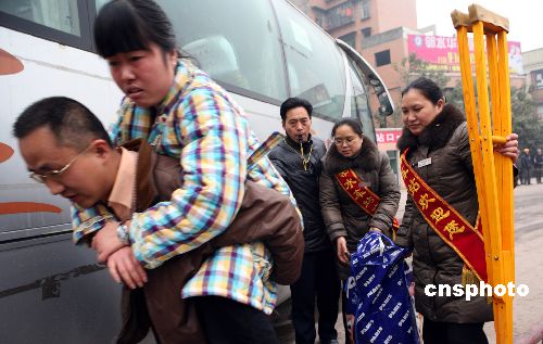 2009年1月17日,四川廣安市鄰水汽車站的服務(wù)人員在熱情幫助病殘旅客上車。春運(yùn)以來,四川廣安市各級(jí)客運(yùn)部門以構(gòu)建和諧春運(yùn)為宗旨,在細(xì)節(jié)和過程服務(wù)上下功夫,安排專門的工作人員在售票大廳、候車室及旅客上、下車區(qū)域主動(dòng)為旅客提供服務(wù),深受旅客歡迎。中新社發(fā) 邱海鷹 攝