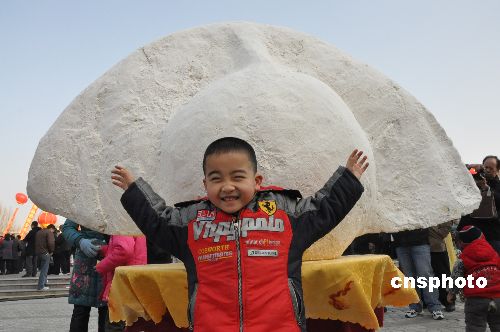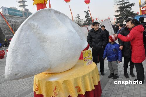 1月18日是農(nóng)歷新春小年,鄭州市“2009歡樂(lè)購(gòu)物過(guò)大年”活動(dòng)在綠城廣場(chǎng)舉行,1.8米長(zhǎng)國(guó)內(nèi)最大的實(shí)物餃子亮相鄭州市綠城廣場(chǎng)。中新社發(fā) 劉書亭 攝