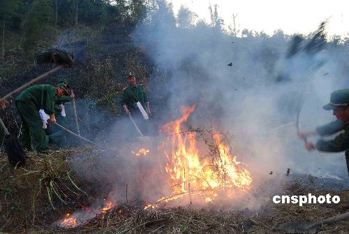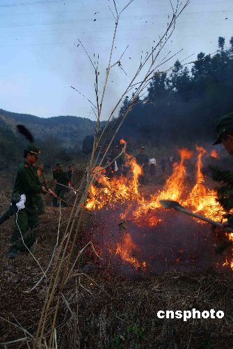 1月20日,武警福建總隊三明支隊官兵在奮力撲火。當日下午16時左右,福建三明市梅列區(qū)洋溪鄉(xiāng)羊口仔村后山由于村民野外用火不慎引起山林大火。駐在附近的武警三明支隊100多官兵經過1個多小時的奮力撲救,終將山火撲滅。中新社發(fā) 盧立杰 攝