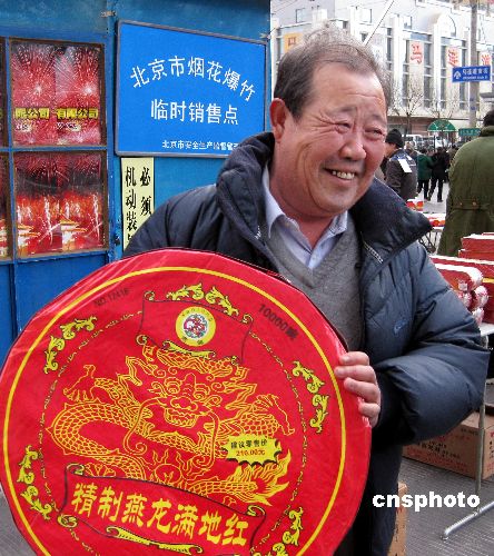 2009年1月20日,在京城馬連道煙花爆竹銷售網(wǎng)點,人們在購買煙花爆竹。今年北京五環(huán)內(nèi)614家臨時銷售網(wǎng)點向市民供應(yīng)煙花爆竹,花炮品種比2008年多了不少,而且價格也降低了10%左右,還增加了奧運系列產(chǎn)品。中新社發(fā) 馬毅行 攝