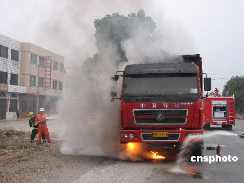 1月21日7時(shí)30分,廣西貴港市港北區(qū)一輛滿載20噸煤炭的大貨車突發(fā)大火,起火部位緊靠油箱,情況十分危急。經(jīng)過消防官兵近1個(gè)小時(shí)的緊張撲救,大火被徹底消滅。中新社發(fā) 李廣永 攝