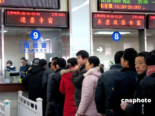2009年1月23日,鐵路南京站售票大廳的退票窗口前排起長(zhǎng)隊(duì)。據(jù)了解,這種狀況已持續(xù)一段時(shí)間;疖嚻币黄彪y求的狀況下尤為引人注目,據(jù)稱多為多渠道重復(fù)購(gòu)票所致。中新社發(fā) 王路憲 攝