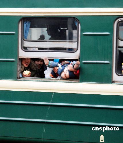 1月21日,在江蘇丹陽(yáng)火車站,一輛列車?吭谡九_(tái)上,一位母親將兒子抱出窗外小便,場(chǎng)景既有趣又讓人感到不安。中新社發(fā) 封波 攝