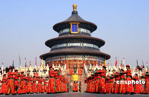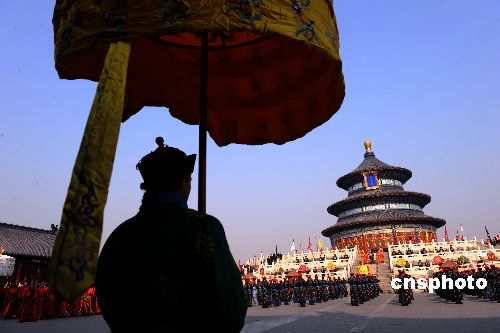 1月28日,北京天壇的祭天盛典。北京天壇公園從農歷大年初一至初五推出祭天樂舞和儀仗展演。演出陣容包括祭天樂舞239人和祭天儀仗280人,演出現(xiàn)場和周邊主要道路有五彩龍旗、云旗、刀旗等1500面,懸掛燈籠1000只,吸引大批中外游客前往觀禮。中新社發(fā) 廖攀 攝