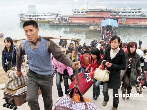 1月30日,10余艘出川客輪穿過(guò)三峽兩壩靠泊在湖北宜昌港,僅大公橋碼頭就有數(shù)千農(nóng)民工上岸分流,三峽春運(yùn)節(jié)后首波高峰如期而至。據(jù)了解,三峽農(nóng)的民工有逢陰歷雙日出門的習(xí)俗,因而高峰客流將兩天出現(xiàn)一次,一直持續(xù)到春運(yùn)結(jié)束。中新社發(fā) 韓玉洪 攝