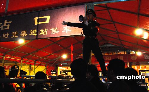 春節(jié)假期接近尾聲,中國鐵路迎來返程農(nóng)民工客流高峰。圖為1月30日晚大批農(nóng)民工正在南昌鐵路局九江火車站準(zhǔn)備上車,一名鐵路警察正站在高處指揮乘客有序進(jìn)站。中新社發(fā) 胡國林 攝