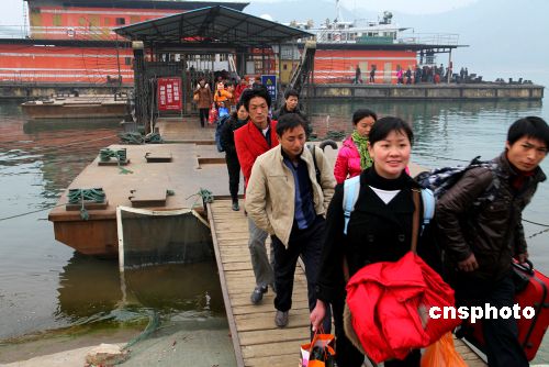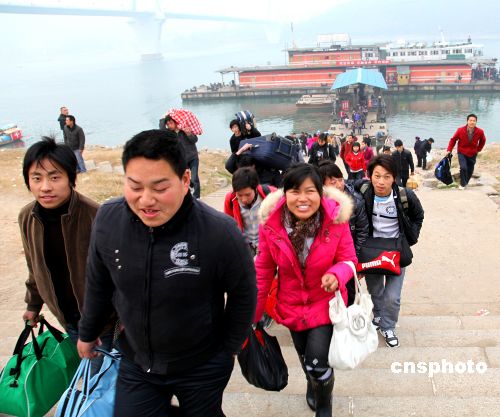 2月1日,47艘客船、高速客船出川,1.5萬(wàn)多名出川農(nóng)民工返城,三峽庫(kù)區(qū)迎來(lái)節(jié)后春運(yùn)首次高峰,海事、公安、港口加大出川旅客進(jìn)港秩序維護(hù),沒(méi)有一艘客船出現(xiàn)超載。中新社發(fā) 望作信 攝