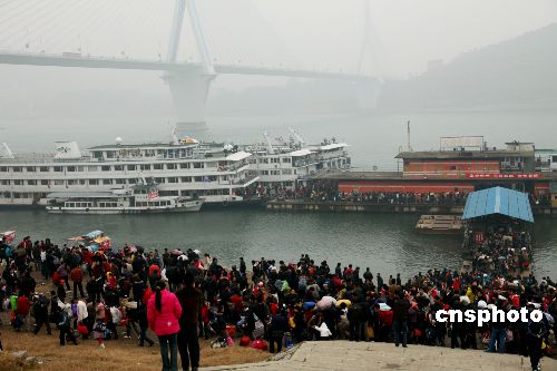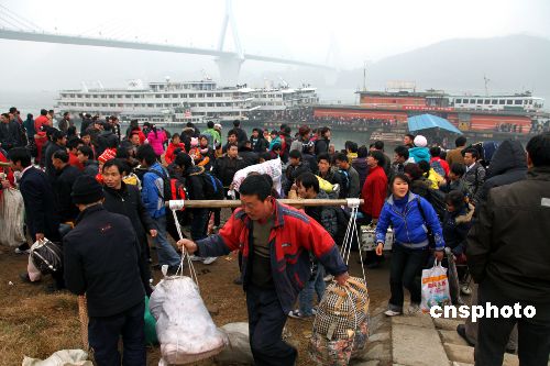 2月3日農(nóng)歷正月初九早8時,長江宜昌港大公橋客運碼頭四條躉船無一客人、無一客船,9時,9艘客船同一船閘、同時停泊宜昌港,一時間,涌入宜昌港口的出川大軍疏散成“井噴”之勢。宜昌海事、公安、港口等部門聯(lián)動執(zhí)法,35分鐘時間內(nèi)緊急疏散4500余人,全部是出川農(nóng)民工。據(jù)統(tǒng)計,三峽春運期間,常年旅客進出客流量約50萬人次,其中外出農(nóng)民工乘船超過40余萬人次。據(jù)悉,三峽庫區(qū)是長江干線跨省春運重點航線,而這一航線又是中國內(nèi)河農(nóng)民工乘船的專營航線,節(jié)前單邊返鄉(xiāng)過年,節(jié)后單邊出川進城打工,客船單邊旅客、客船高度集中,是中國內(nèi)河不多見的春運現(xiàn)象。中新社發(fā) 望作信 攝