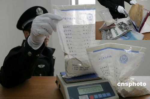 二月三日,福州海關(guān)緝私警察展示新繳獲的毒品海洛因。連日來,福州海關(guān)駐長(zhǎng)樂機(jī)場(chǎng)辦事處旅檢關(guān)員在對(duì)吉隆坡-廣州-福州航班進(jìn)行監(jiān)管時(shí),連續(xù)查獲三起東南亞籍旅客涉嫌走私毒品入境案件,共繳獲毒品海洛因凈重四千六百七十七點(diǎn)六克,抓獲犯罪嫌疑人三名。中新社發(fā) 陳多 攝