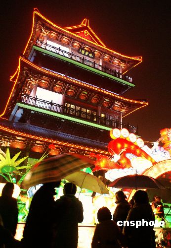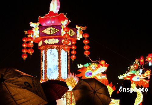 2009年2月2日晚,江蘇省鹽城市在剛落成不久的鹽鎮(zhèn)風(fēng)情文化水街開始舉辦首屆新春燈會,主題為“盛世中華和諧鹽城”。用“龍騰盛世”、“鶴鹿同春”等一組組流光溢彩的燈飾造型著力展現(xiàn)“東方濕地之都,仙鶴神鹿故鄉(xiāng)”的獨特風(fēng)采。雖然有連綿的陰雨,市民賞燈的激情卻絲毫沒有削減,一個個打傘賞燈的身影游動在絢麗繽紛燈海中,使燈火點綴的仿古景區(qū)更添幾分情趣。中新社發(fā) 李根 攝