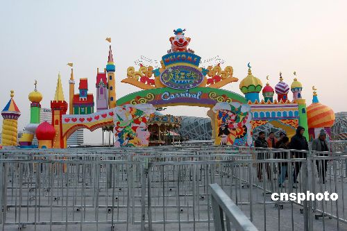 2月3日,北京奧運中心區(qū)環(huán)球嘉年華的各項準備工作正在加緊進行中。距離鳥巢僅200米的“環(huán)球嘉年華”項目面臨著嚴格的審批,由于手續(xù)尚未辦妥,原定于正月初五的開放時間被延遲至月底。環(huán)球嘉年華是奧林匹克公園公共區(qū)的首個大型室外娛樂項目,占地5萬平方米,設有近百個游樂項目。中新社發(fā) 鄭雄增 攝