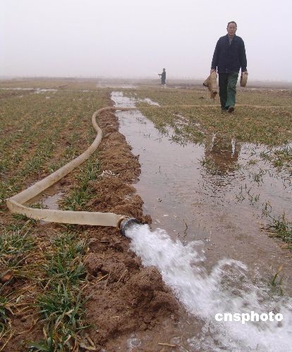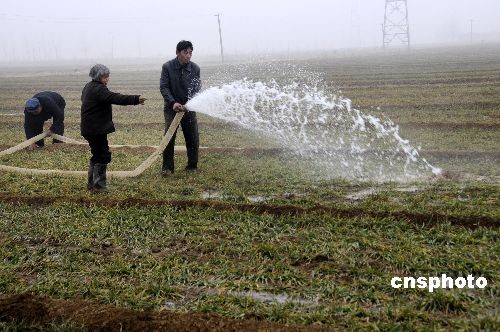 2月5日,山東省臨沂市沂南縣蘇村鎮(zhèn)農(nóng)民在用噴灌澆麥。今年臨沂市小麥?zhǔn)芎得娣e達(dá)到390萬畝,其中重旱面積達(dá)210萬畝。臨沂市因地制宜,推廣“長龍”節(jié)水灌溉技術(shù)!伴L龍”是一種塑料軟管,灌溉澆水時接在水泵上,通過這種軟管導(dǎo)水入田,并視灌溉情況可隨時移動。中新社發(fā) 杜昱葆 攝
