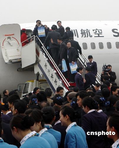 2月8日,河南鄭州至臺(tái)北首個(gè)空中直航于此間正式開通。當(dāng)日,滿載著一百三十余名乘客的深航銀川號(hào)B—5378航班從鄭州新鄭國(guó)際機(jī)場(chǎng)起飛,兩個(gè)半小時(shí)后將抵達(dá)臺(tái)北桃園機(jī)場(chǎng)。較之以前的從鄭州飛到香港轉(zhuǎn)機(jī),可節(jié)約一半以上的時(shí)間。中新社發(fā) 李志全 攝