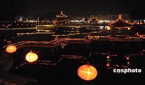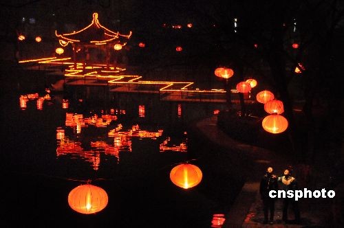 2月7日晚在山東省棗莊市山亭區(qū)太清湖公園內(nèi)拍攝的元宵燈海。連日來,山東省棗莊市山亭區(qū)太清湖公園內(nèi)張燈結(jié)彩,喜迎元宵佳節(jié)。夜幕下的湖中倒影璀璨繽紛,整個(gè)公園仿佛燈的海洋。中新社發(fā) 李宗憲 攝