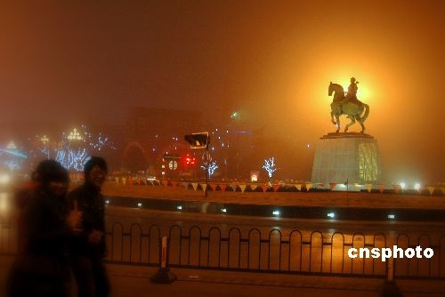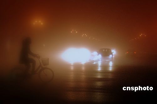 從2月7日晚起,江蘇鹽城市及蘇北地區(qū)出現(xiàn)春節(jié)后的首場(chǎng)大霧,城市街道夜晚能見(jiàn)度不足50米。氣象專(zhuān)家說(shuō),由于立春以來(lái)的氣溫不斷回升,冷暖空氣交會(huì),近日早晚還將持續(xù)大霧天氣,提請(qǐng)出行的人們和車(chē)輛注意交通安全。中新社發(fā) 周晨陽(yáng) 攝