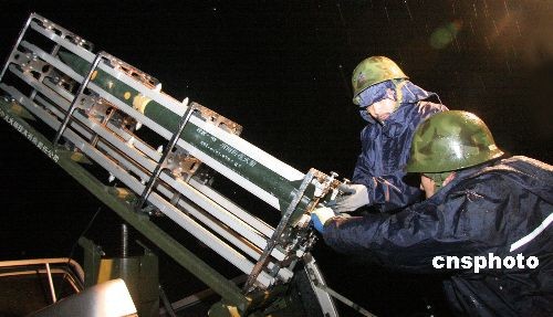 2月9日凌晨許,江蘇連云港市氣象局工作人員在該市陡溝鄉(xiāng)發(fā)射“人工增雨火箭彈”,進(jìn)行人工增雨。江蘇連云港市自去年入冬來,遭遇罕見的無雨天氣,致使全市235.6萬畝農(nóng)作物受旱較嚴(yán)重。當(dāng)?shù)貧庀蟛块T根據(jù)對降雨云系監(jiān)測,決定在2月8日夜間至9日凌晨發(fā)射“人工增雨火箭彈”,進(jìn)行人工增雨。截止目前共發(fā)射“人工增雨火箭彈”32枚,全市普遍降雨量達(dá)到5毫米以上,望眼欲穿的“喜雨”終于從天而降,為久旱的大地送來了甘霖。 中新社發(fā) 王振 攝