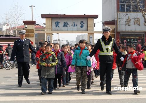 2月10日,交通民警護送小學生安全過馬路。當日是山東省棗莊市各中小學開學首日,棗莊市臺兒莊區(qū)公安交警大隊在中小學門前設(shè)立“護校崗”,增派警力負責指揮疏導學校門前的交通秩序,護送上下學的廣大師生安全過馬路,保證了轄區(qū)廣大中小學生高高興興上學,平平安安回家。中新社發(fā) 高啟民 攝