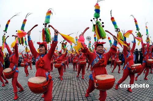 2月10日,在有“天下第一鼓”美稱的河北藁城市,上萬名當(dāng)?shù)厥忻癜选皯?zhàn)鼓”搬到了廣場(chǎng)上,擊鼓狂歡慶新春。中新社發(fā) 鮑榮華 攝
