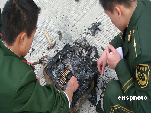 2月11日,浙江省蒼南縣炎亭邊防派出所民警下鄉(xiāng)走訪時,遇見漁民陳某正在家門口用榔頭敲打一個表面裹滿了泥沙的木箱子,打開后發(fā)現(xiàn)有1000余發(fā)軍用子彈。據(jù)邊防民警介紹,這箱子彈保存較為完好,大約戰(zhàn)爭年代遺留下來,是漁民陳某在2月10日出海作業(yè)時從海底打撈上來的,誤當作稀有“古董”運回家中收藏。目前,警方已依法對這箱子彈進行了收繳。中新社發(fā) 吳水斌 攝