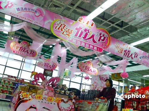 2月12日,上海一家超市內(nèi)布置的“情人節(jié)”浪漫專區(qū)。距離情人節(jié)還有兩天,上海商家的“甜蜜攻勢(shì)”已經(jīng)全面展開,有關(guān)情人節(jié)的各類商場(chǎng)布置和促銷禮盒已一一登場(chǎng)。中新社發(fā) 井韋 攝