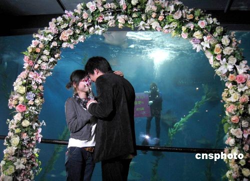 2月14日情人節(jié),上海一名女孩在神秘的“海洋世界”前瑰麗的彩花門下接受男友求婚后,相擁盡享甜蜜時(shí)光。上海海洋世界在情人節(jié)為申城情侶開啟愛(ài)情的夢(mèng)幻大門,在海洋水族館巨大玻璃前設(shè)立花門,有情人紛紛在此情定終生,讓神奇的“海洋世界”為他們見證愛(ài)情。中新社發(fā) 陳靜 攝