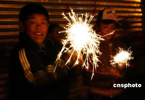 2月23日晚,拉薩城鞭炮齊鳴,燈火通明,街頭到處是燃放煙花的孩子。今晚是藏歷二十九的“古突”節(jié),一般都要吃“古突”(即面圪瘩)和作驅邪的活動,人們走上街頭燃放煙火,象征除舊立新,消災免禍。中新社發(fā) 劉震 攝