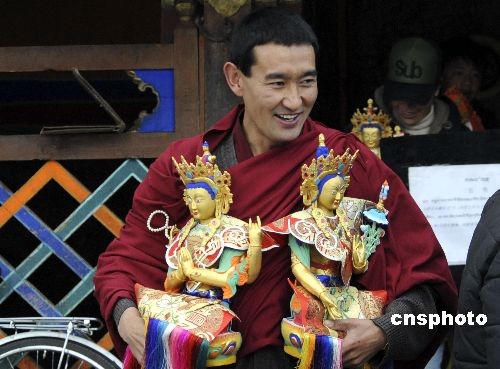 2月24日,中國藏歷年三十,西藏拉薩大昭寺僧人愉快地接待請佛信眾。中新社發(fā) 廖攀 攝