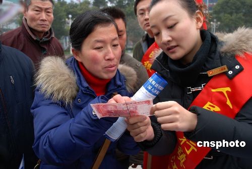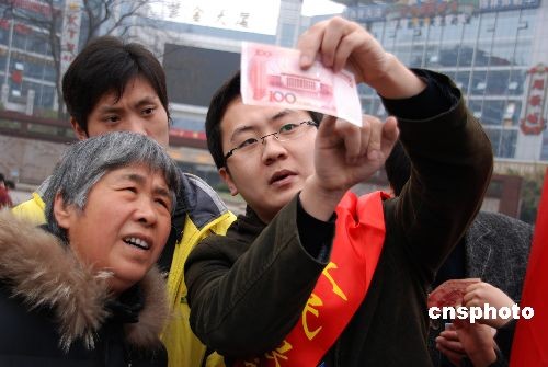2月24日上午,反假貨幣“壁壘行動(dòng)”在江蘇鎮(zhèn)江大市口廣場(chǎng)啟動(dòng)。據(jù)悉,由中國(guó)人民銀行鎮(zhèn)江市中心支行組織全市各金融機(jī)構(gòu)以及公安部門(mén)將進(jìn)行為期三個(gè)月的反假貨幣宣傳活動(dòng),活動(dòng)還將成立反假宣傳小分隊(duì)深入到社區(qū)、商場(chǎng)、農(nóng)貿(mào)市場(chǎng)、車(chē)站、農(nóng)村等地向群眾宣傳反假幣知識(shí)和相關(guān)法律常識(shí)。中新社發(fā) 封波 攝