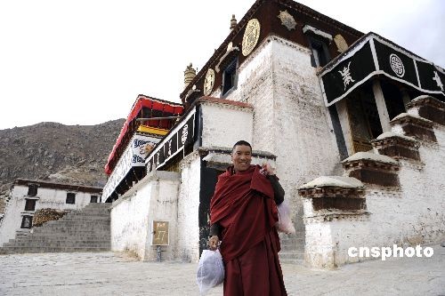 2月24日,藏歷年三十,拉薩哲蚌寺內(nèi)一位喇嘛背著大包年貨進(jìn)入佛殿。中新社發(fā) 廖攀 攝