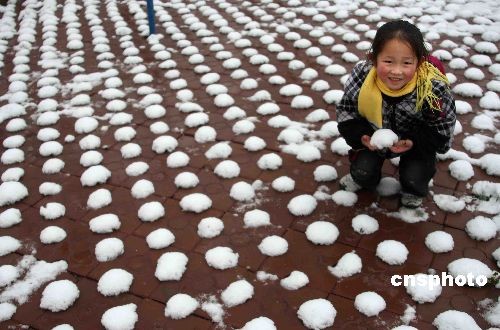 2月26日,河南省洛陽市洛寧縣興寧公園7歲的佳琦在玩弄地上的積雪,團團的白雪好象一個個白饃,十分可人。中新社發(fā) 曾憲平 攝
