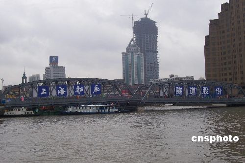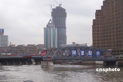 圖:上海外白渡橋南北兩跨橋體正式合攏蘇州河