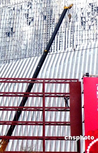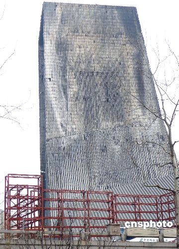 2009年2月26日,北京中央電視臺(tái)新址火災(zāi)北配樓旁,工人正在搭建腳手架和圍擋,準(zhǔn)備拆卸被燒毀的外殼進(jìn)行修復(fù),預(yù)計(jì)今年內(nèi)完工。中新社發(fā) 玉龍 攝