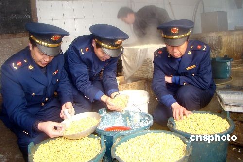 2月27日,江蘇連云港市連云工商分局執(zhí)法人員突擊行動,在連云區(qū)院前路當場端掉正在生產(chǎn)豆腐的兩個黑窩點。工商執(zhí)法人員當即查封了這兩家豆腐作坊,封存了生產(chǎn)工具,并責令限期整改。中新社發(fā) 王春 攝